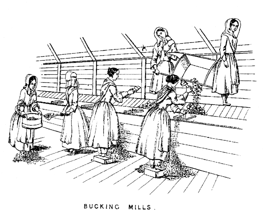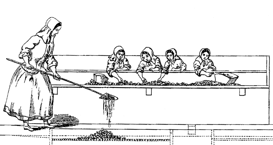 Mining was frequently a family affair. In the early 1800s, women and children were working in the mines as well. Although women are not reported as working underground, young women took work as bal maidens, dressing ore at surface. Using special hammers, they would carefully select and crush the ore to a manageable size before further processing. Heavy “bucking” and “cobbing” hammers were used for this which required particular techniques to effectively separate the ore from the waste mineral (known as gangue).