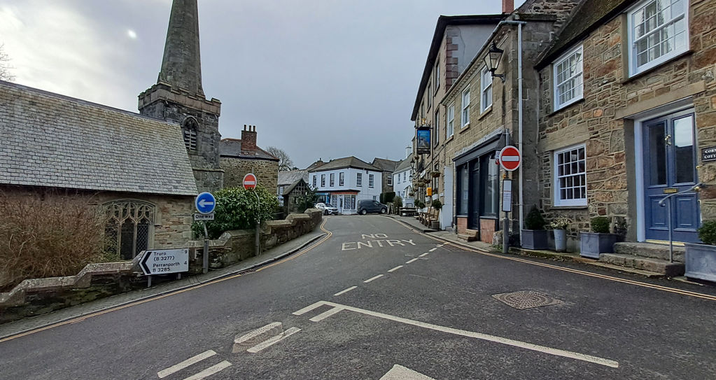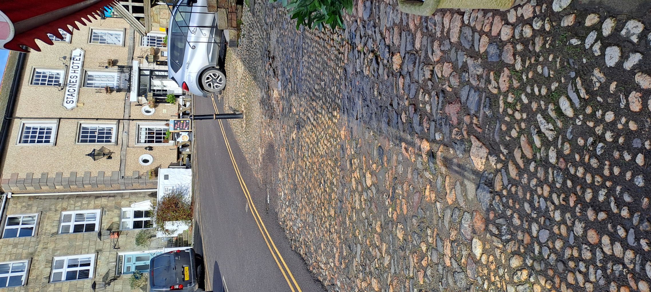 Narrow pavements with low kerbs. Uneven surfaces, including historic cobbles.